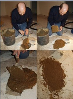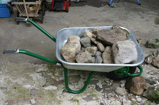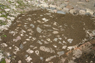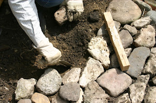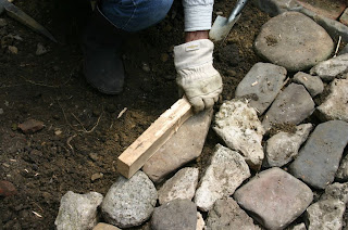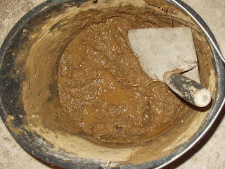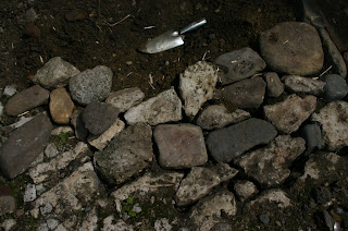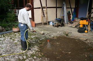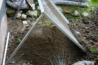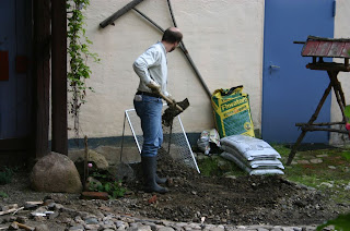 had to be in a next step, the interstices filled with a kind of mortar. We used for mortar (gravel-sand), at its own recipe, which we had previously recovered from the sieved soil from the "excavation".