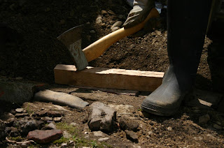 After we had selected the correct tiles began the brutal part of the work;) The paving stones had to be beaten into the ground. My husband did it by hitting with the blunt side of our ax to a piece of wood lying on the stones: