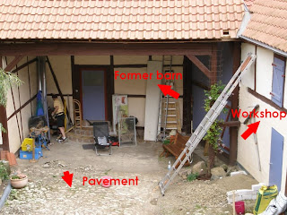 our house and two outbuildings (one workshop and a former stable block, built by the previous owners to a seminar house) form a courtyard of 150m ². Most of it is covered with a historic setting, which consists of sandstone and boulders.